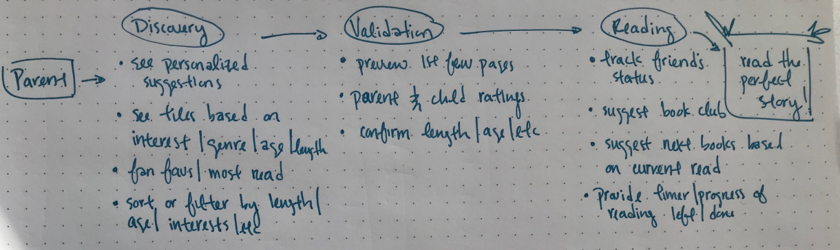 Through the research, I found what motivates parents. They believe reading is important for children because it helps build their confidence and is a good way to teach life lessons in a fun way. Most parents want to read stories with some sort of educational content or lesson, or have the story relate to their child’s lives at the moment. Parents also want to know the typical length of the book so they can properly choose the story to read for their bedtime schedule. However, parents are finding it difficult to find the right story to read to their children and, as a result, spending too much time in the discovery phase.