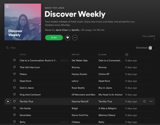 Spotify is well known for their simple UI and addicting Discover Weekly playlists using their recommendation algorithm.