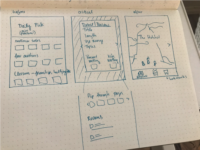 The 2nd drawing from the bottom row represents the detail screen containing relevant information. This screen answers the decision-making phase where parents decide whether the book their children chose is right for them.